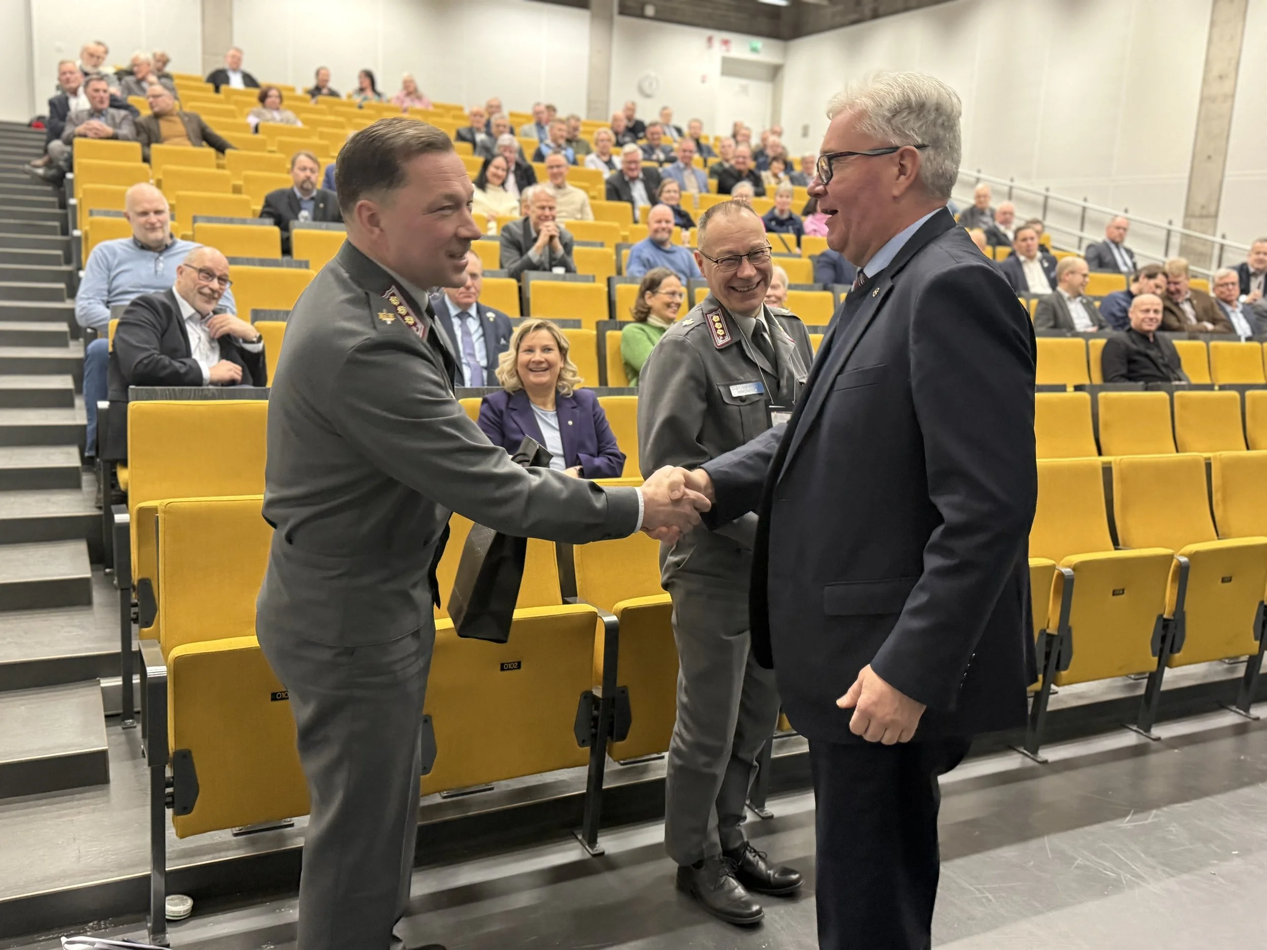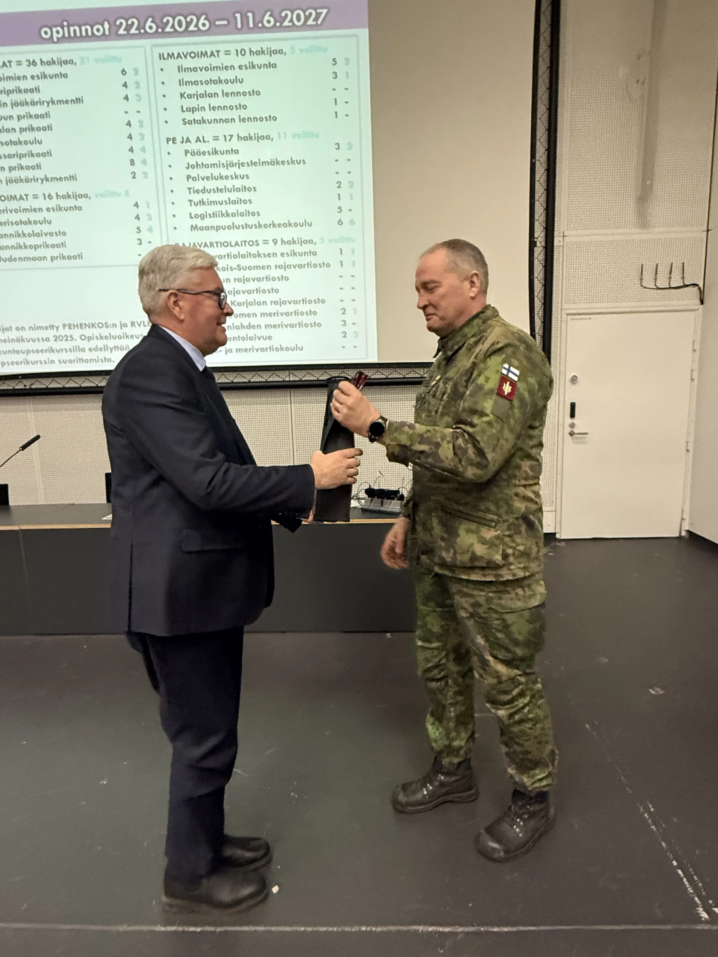 Maanpuolustuskorkeakoulun koulutuspäällikkö, everstiluutnantti Jarmo Kiikka vastaanottaa yhdistyksen kiitoksen alustuksestaan.