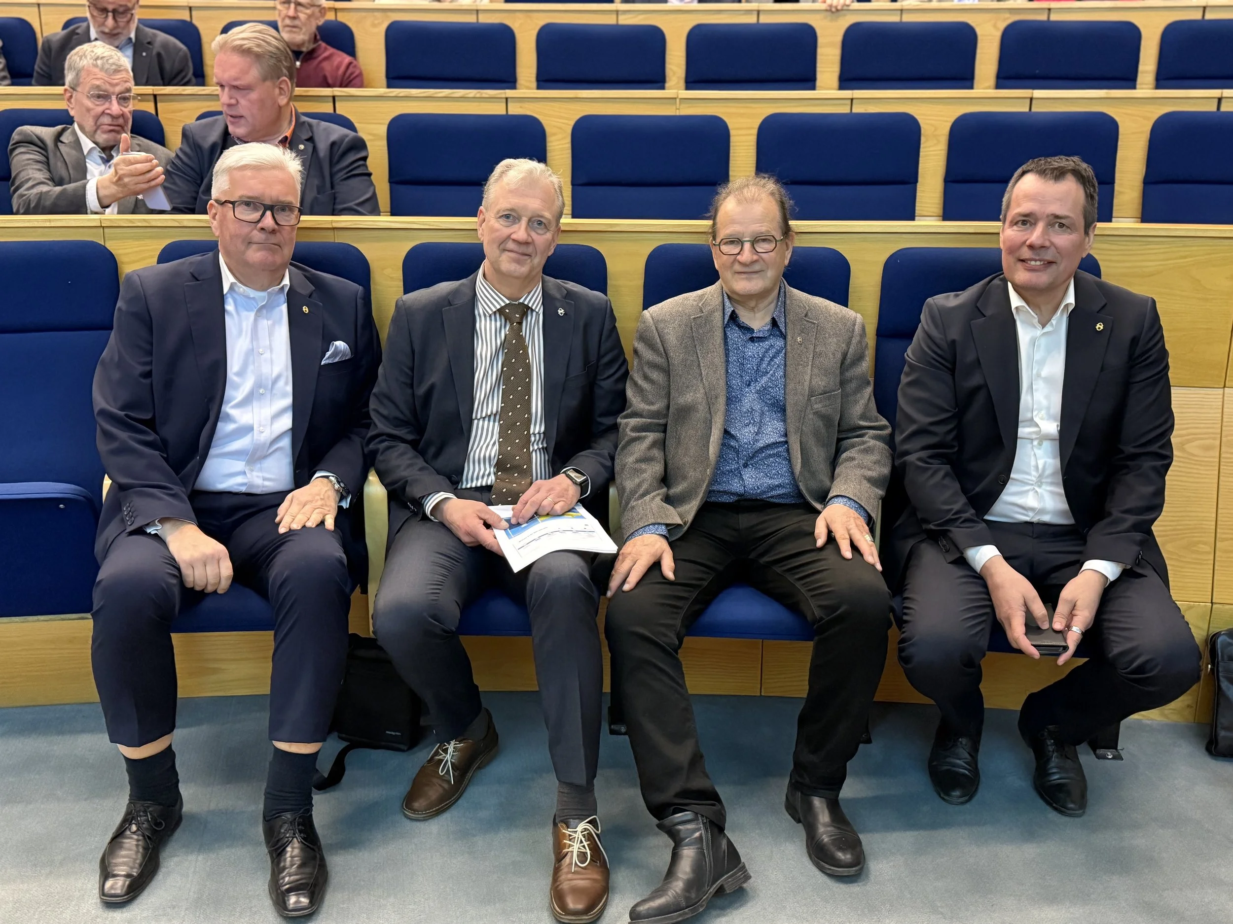 Yhdistyksen puheenjohtaja Juha Hakola, ev evp Petteri Kajanmaa MPKK, yhdistyksen kunniapuheenjohtaja Matti Virpiaro ja Johtaja Petri Vuorio EK.